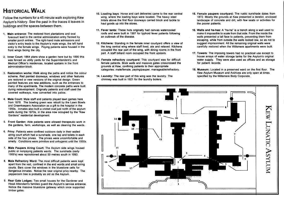 therapies, routine work and strong moral guidance. Kew was one of the largest asylums ever built and conveyed the great optimism of the Victorian colony after the Gold Rush. It was known as a "barracks" style building, with two great wings, one for women and the other for men, and neat rows of beds in each ward. Mealtimes, toilet access and social activities followed a regular timetable, in order to create an environment of normality. Smaller versions of Kew were constructed at Beechworth and Ararat. Unfortunately Kew Asylum never lived up to these high expectations. Few patients were ever cured and released back into the community. Inadequate government funding encouraged gross mistreatment of patients and Kew was subject to repeated public criticism leading to a Royal Commission in 1886. For the first half of this century conditions and morale were low. In the 1950s a new wave of reform came, with widespread criticism of the huge nineteenth century medical institutions. The Mental Hygiene Authority turned Kew into the Willsmere Mental Hospital, for the care of aged patients who had psychological problems and physical diseases such as Alzheimer's. Kew was earmarked for closure and eventually ceased operating in 1988, with the buildings and huge grounds sold for private development.