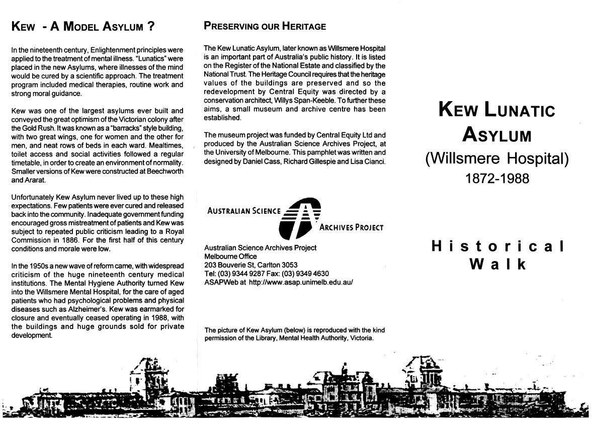 | The Kew Asylum or Willsmere project was a fairly unusual one for ASAP combining an Archive, Museum, and Resource Collection. Before discussing the project, It would be advantageous to know something of the history of Kew Asylum. Below is a very brief history written by Daniel Cass, the historian who did the research and archival work for this project. |