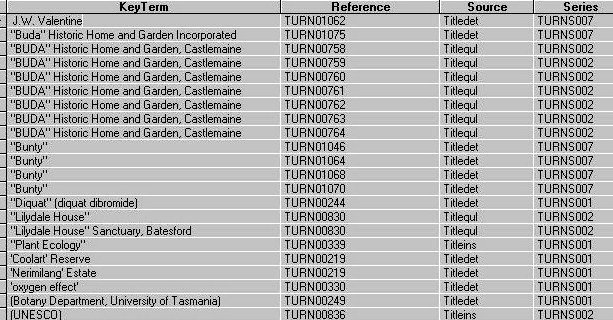 ![]() While detailed inventory listing is occurring, or after detailed inventory listing has occurred, relevant subjects, names of individuals, organisations, or terms can be copied and pasted into the Indexing Terms table. There are two main fields used - one on the left for the term as it is found in the inventory whatever the variations (because we use natural text in our descriptions), and one on the right for how that term will appear in the finished index. In this way we can have a "many to one" relationship - especially where names have been entered differently, or where file titles include misspellings or discrepancies. Of course this area is still under development. We are also looking at the many possibilities with related terms, and sub-terms. So, once the Indexing Terms table has been completed, an index can be generated by the ADS. What this means is that another table is created that links every occurrence of the keyterms in the first column by means of the Inventory Id Number (which is the unique identifier), with the index term in the second column. Once this table has been created, there are many uses for it. For the Turner printed guide, a report has been developed in Access that will take each index term and then show each Series and Unit number that relates to it as a long list underneath. Once again, this report is output as an RTF file and edited in Microsoft Word with a series of Macros to edit the text and produce the finished index. Indexing is proving to be quite an art form - we have been in contact with the Australian Indexers Society in Melbourne for advice, and are using a variety of projects at present to develop some protocols for how we index records. Although much of the way we index records can be consistent across projects, the diversity of our projects requires that a certain amount of individual consideration be given to each one. As with Turner, botanical terminology has been included where relevant, but in many projects, a whole other set of keyterms may be identified. It's always difficult to know how much to include, and also what not to include in the index. A term that has too many reference points is not much help to the user. Louise Anemaat (Mitchell Library) discusses in her paper about the Banks Imaging Project, the difficulties of indexing - and there are certainly many issues to consider. In fact one could probably keep indexing indefinitely, but eventually, time, money or both run out. Often the level of detail in the index will be determined by the amount of funds we have for that project, or the perceived importance of the records. It is the same for the level of archival description in the Accession, Series, Provenance and Inventory tables in the ADS. Because the ADS can generate the index as and when required, we can analyse the index at certain stages of the project - see how many reference points there are for each term, and make decisions about whether we include a term, whether we need to be more specific, or more general in the way we are indexing. We need to consider how the index will be used, and what users might be looking for.