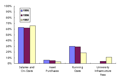 research and heritage projects. In 1996, the Industry Sector provided over 90 per cent of ASAP's income. While the income from Scientific and Medical Institutions increased by 9 per cent, this reflected increased commitments by existing clients rather than new work. ASAP's expenditure changed between 1995 and 1996 with salary expenditure increasing by 22 per cent and spending on assets by 10 per cent, reflecting the increased infrastructure needed to run large-scale projects. The overall division of spending between areas remained relatively constant, with salaries by far our main expense. 1996 also saw a substantial increase (38 per cent) in project specific expenditure. This expenditure reflects the cash flow generated by large purchases made by ASAP on behalf of our clients, which attract an administrative fee but do not otherwise add to ASAP's revenue. Figures 3a and 3b detail the income and expenditure breakdown for 1995 and 1996.
